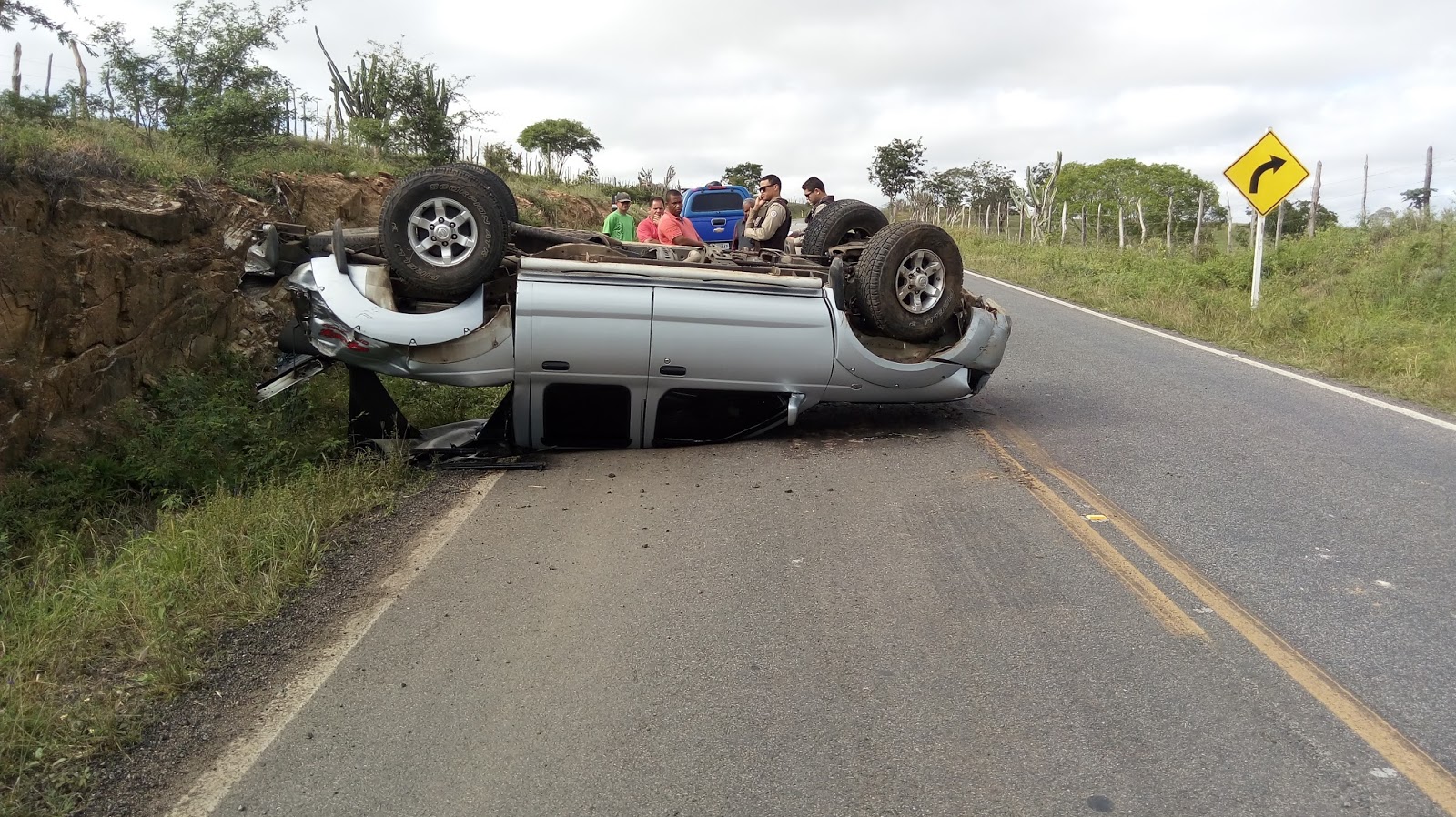 Uma caminhonete Nissan/Frontier 4x4 SE, de cor prata, placa DMT-4166, de Santana de Parnaíba-SP, capotou após ser fechado por um caminhão.
