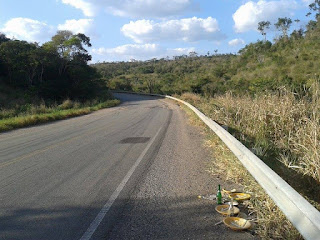 Um despacho de macumba foi colocado em uma curva da rodovia BA-052, conhecida como Estrada do Feijão, entre Baixa Grande e Mundo Novo.