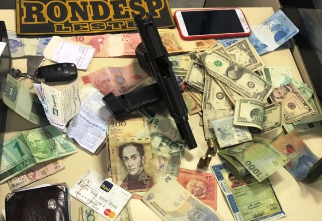 Durante a diligência, ao se deparar com o reforço policial, um dos suspeitos investiu contra a guarnição, efetuando vários disparos quando também os policiais revidaram, atingindo o suspeito. Com o suspeito, a Policia apreendeu apreendida uma pistola Taurus de calibre .40, com apenas quatro cartuchos intactos no carregador, além de um aparelho celular e um grande número de cédulas de dinheiro de vários países.