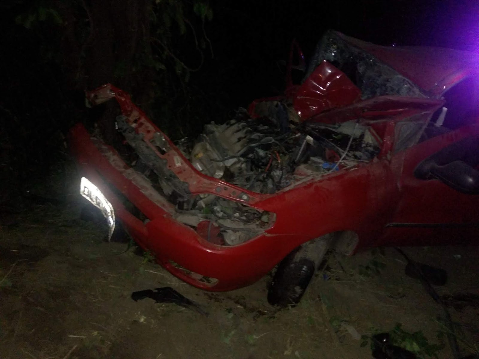 Na colisão o veículo Palio de cor Vermelho se chocou com uma árvore,no